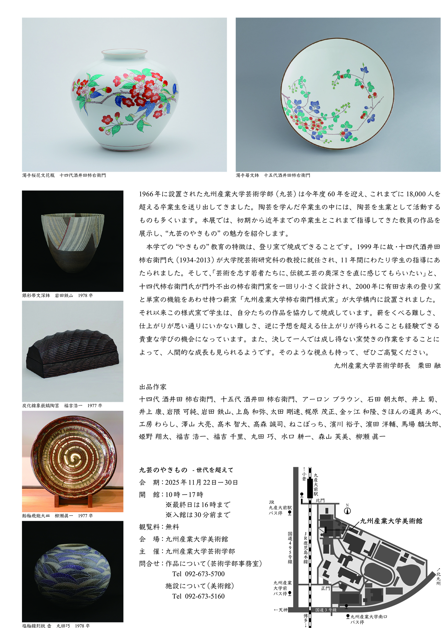 1966年に設置された九州産業大学芸術学部(九芸)は今年度60年を迎え、これまでに18,000人を超える卒業生を送り出してきました。陶芸を学んだ卒業生の中には、陶芸を生業として活動するものも多くいます。本展では、初期から近年までの卒業生とこれまで指導してきた教員の作品を展示し、“九芸のやきもの”の魅力を紹介します。