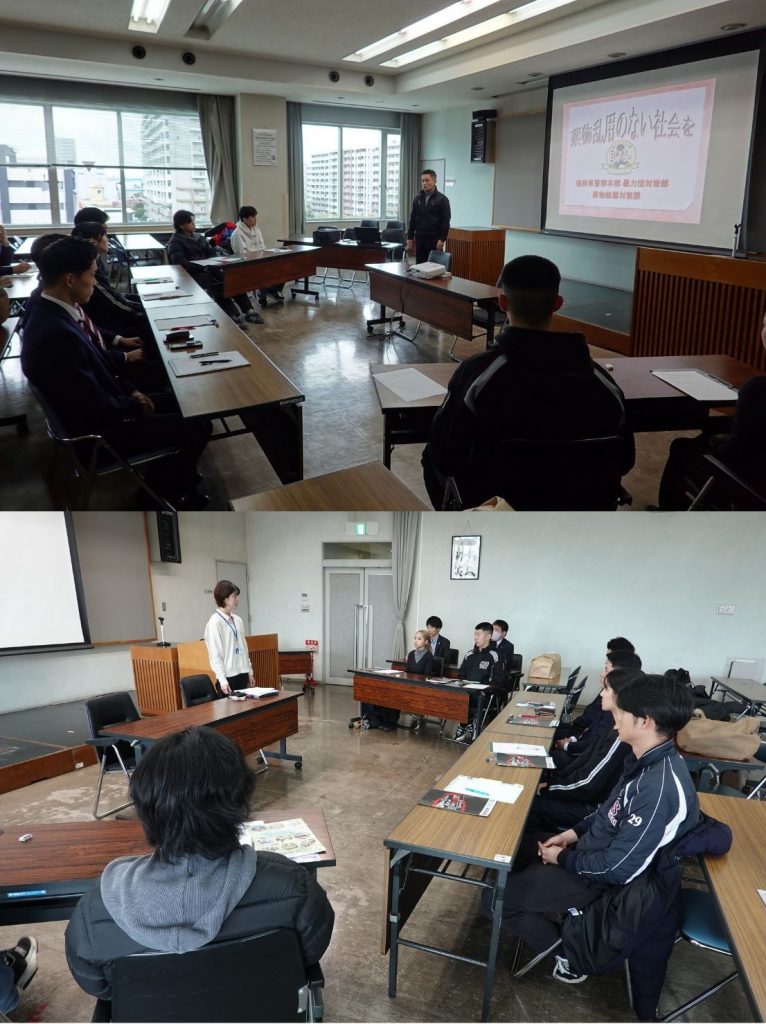 本学では、福岡県警察による薬物乱用防止に関する講演会の開催、本学で制作した啓発動画の授業内での視聴など、継続的な啓発活動に取り組んでいます。