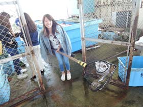 次に、販売準備の手伝いを行いました。生簀から魚を移す作業では、活きの良い魚の前に苦戦しましたが、学生たちにとって、貴重な体験をすることができました。販売準備をする中で、志賀島の方に、『志賀島のご当地グルメとして有名な「金印カレー」を食べたことがあるか』などの聞き取り調査を行う学生もいました。