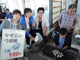 弘の夕市では「サザエ飯弁当」や「サザエのつぼ焼き」の販売などを行いました。学生たちは大きな声で販売をし、「サザエ飯弁当」を完売させることができました。また、販売を通して、志賀島の方との交流を深めることができました。