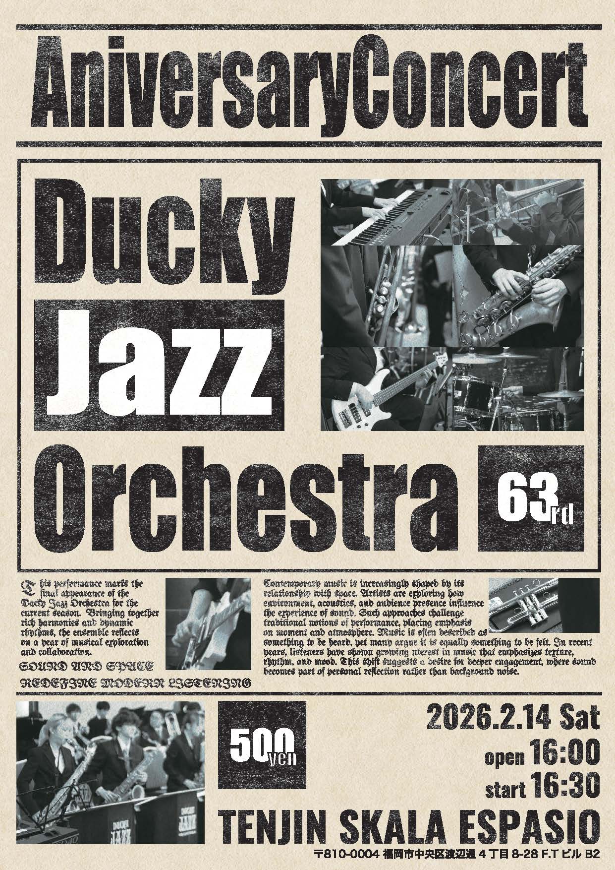 2月14日(土)、福岡トヨタホールスカラエスパシオ(福岡市中央区)で九州産業大学ダッキージャズオーケストラ「第63代定期演奏会」を、開催いたします。