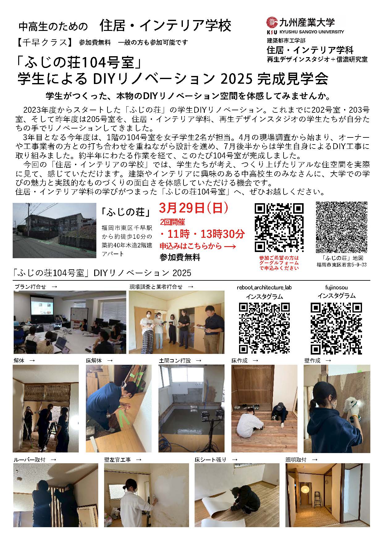 建築都市工学部住居・インテリア学科では、3月29日(日)、中高生を対象とした体験型プログラム「中高生のための住居・インテリア学校(千早クラス)」を「ふじの荘」(福岡市東区)にて開催します。