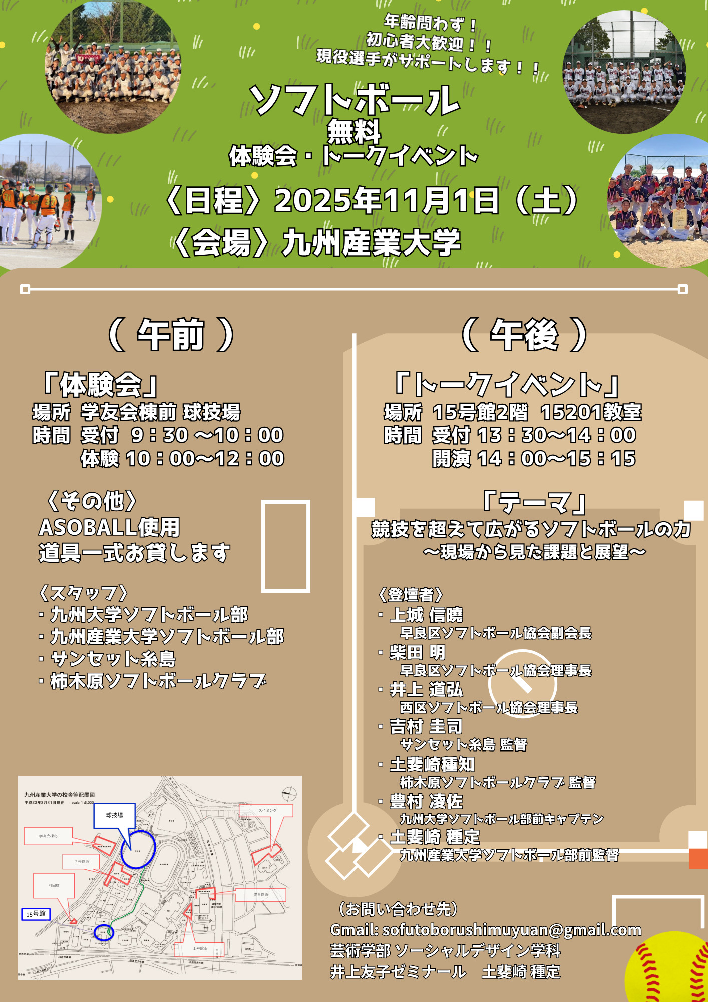 11月1日(土)、本学球技場にて、芸術学部ソーシャルデザイン学科井上友子研究室の学生が、一般の方を対象としたソフトボール体験会・トークイベントを開催します。