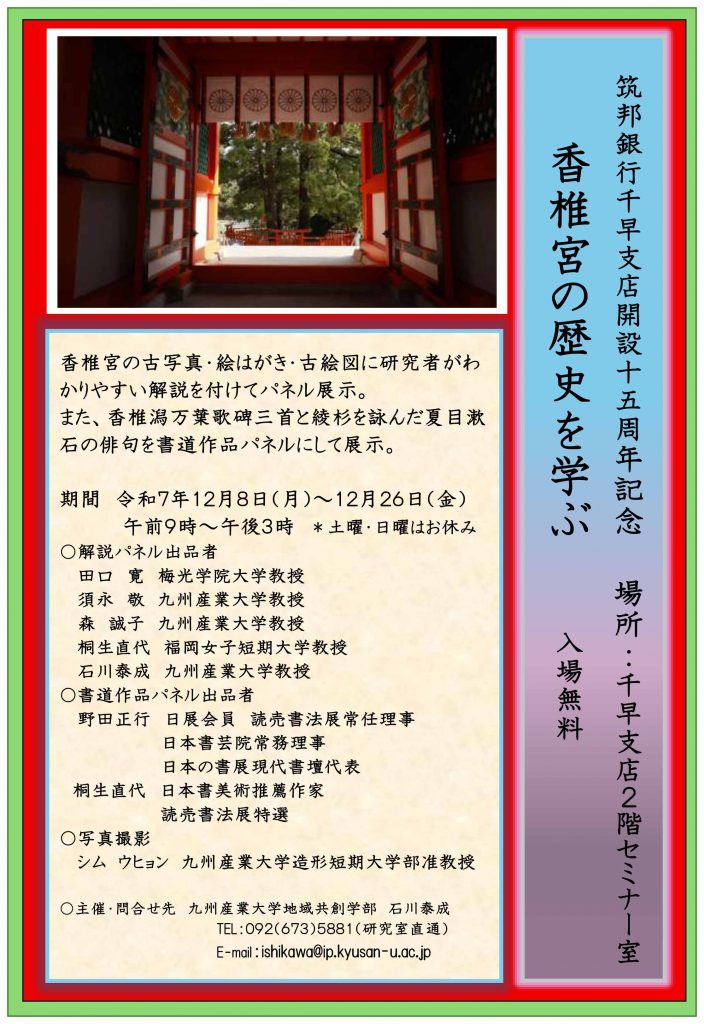 12月8日(月)から26日(金)の期間、筑邦銀行千早支店の2階セミナー室にて「香椎宮の歴史を学ぶ」を開催します。