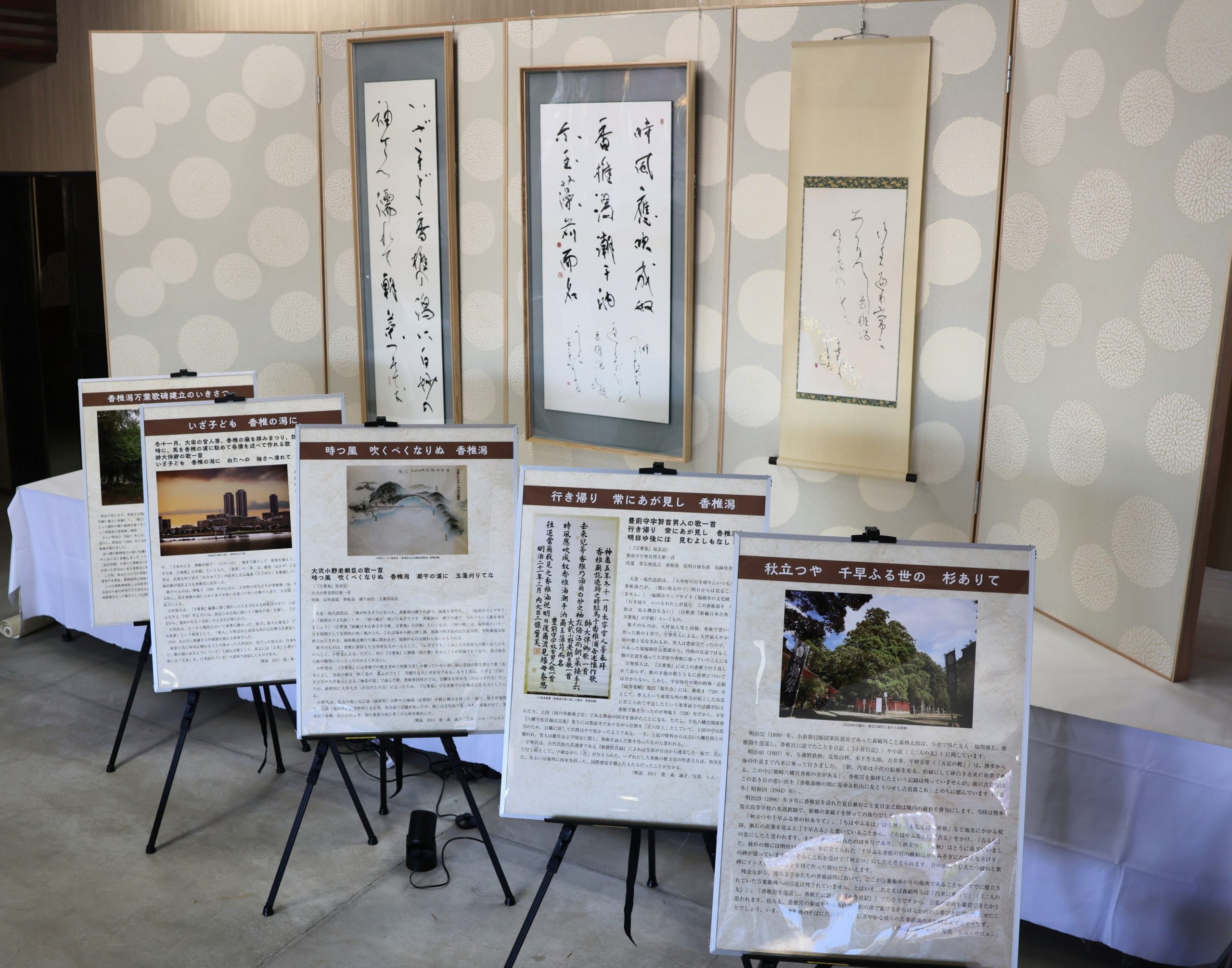 本展示会は、2025年が香椎宮勅祭の年であることを記念したもので、現代書家が香椎宮頓宮境内の万葉歌碑に収める歌3首をしたためた書美作品と、文学研究者による解説パネルを展示しています。解説は地域共創学部観光学科 石川泰成教授、基礎教育センター 森誠子教授をはじめとした文学研究者が作成。パネル掲載写真は造形短期大学部造形芸術学科 沈佑炫准教授 が撮影しました。