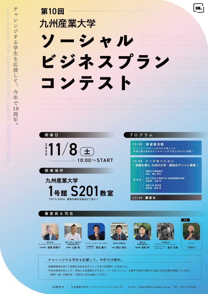11月8日(土)、本学1号館S201教室にて、オープンイノベーションセンターインスペース主催「第10回ソーシャルビジネスプランコンテスト」を開催します。