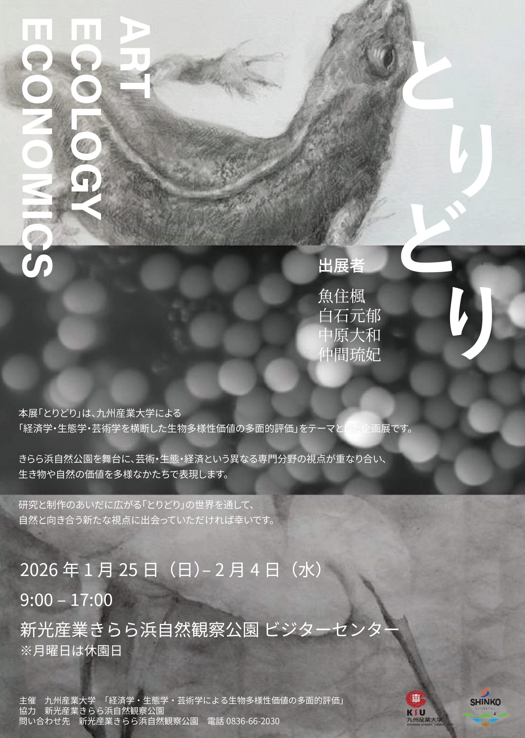 本展は、九州産業大学大学院のプロジェクト実践演習「経済学・生態学・芸術学による生物多様性価値の多面的評価」を履修する学生による展示です。