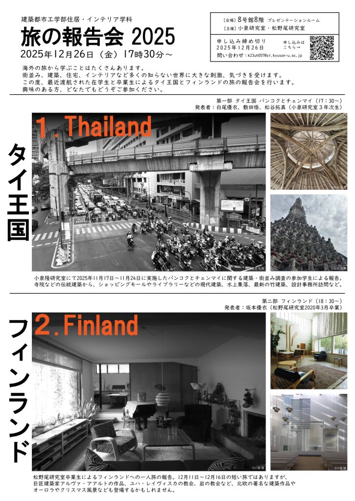 12月26日(金)、本学8号館8階プレゼンテーションルームにて、建築都市工学部住居・インテリア学科の小泉隆研究室と松野尾研究室主催「旅の報告会 2025~タイ王国とフィンランド~」を開催します。