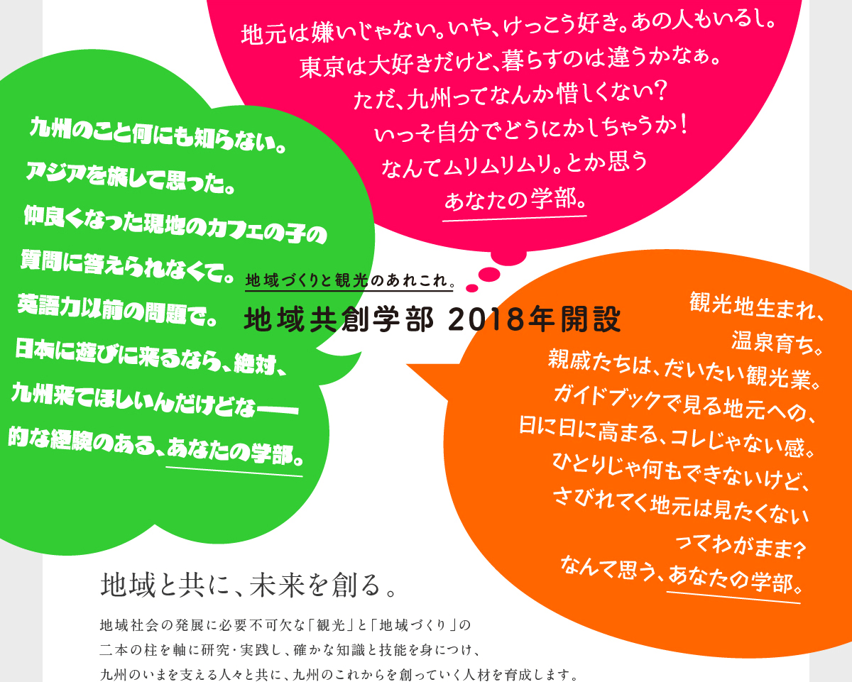 地域づくりと観光のあれこれ。地域共創学部2018年開設。地域と共に、未来を創る。地域社会の発展に必要不可欠な「観光」と「地域づくり」の二本の柱を軸に研究・実践し、確かな知識と技能を身につけ、九州のいまを支える人々と共に、九州のこれからを創っていく人材を育成します。