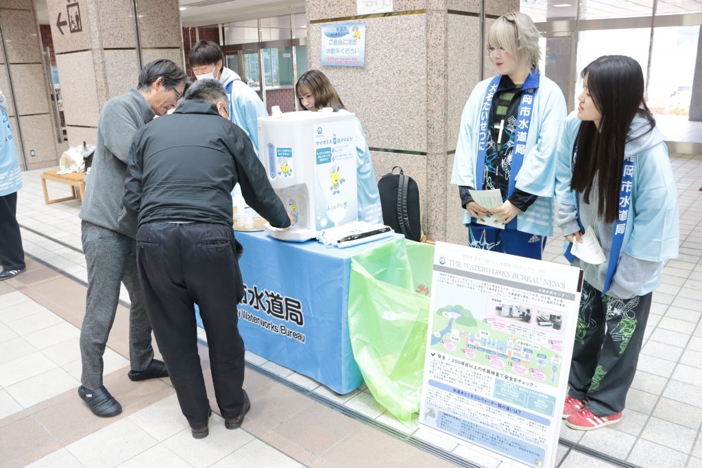 当日は水道水とミネラルウォーターの飲み比べブースを設置。受講学生たちがブースへの呼び込みを行い、学内を行き交う学生や教職員に同局の取り組みの紹介を行いました。飲み比べに参加した学生や教職員からは「どっちが水道水か分からない」、「今度から水道水も飲むようにします」といった感想が聞かれました。