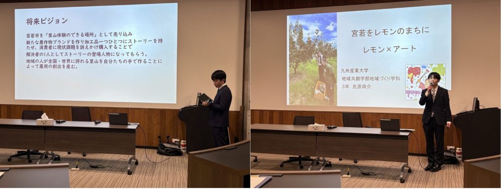 発表には、福岡県、宮若市、里山レモンの会、一般社団法人TEAMみやわかじまん、株式会社トライアルホールディングス、カルチュア・エクスペリエンス株式会社(TSUTAYAや蔦屋書店のフランチャイズの事業運営等を手がける企業)の関係者が参加。学生の視点から、里山レモンの情報発信、耕作放棄地の活用や脇田温泉の活性化について4つの提案を行いました。