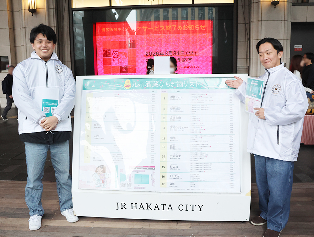 3月19日(木)~24日(火)、地域共創学部観光学科牧 一郎教授のゼミに所属する4年生が、JR博多シティイベント広場にて開催された「九州酒蔵びらき」に、ボランティアスタッフとして参加しました。