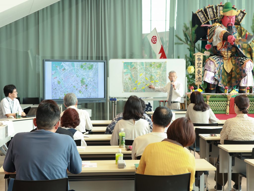 末松教授は、山笠に見られる神仏習合や町名の整理事業の影響、長法被が解禁となる毎年6月1日にみられる旧暦の名残など、歴史文化の視点から幅広く言及。「山笠は多世代が関わり、役割を持つことで各々が成長を実感できる素晴らしい祭り。これから先も山笠を存続させていくために、何を残し、変えていくのかを考えるのが大切である。」と述べました。