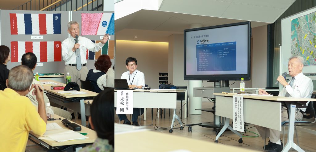 特別講師に博多祇園山笠振興会の第9代会長瀧田喜代三氏を迎え、地域共創学部地域づくり学科の末松剛教授との掛け合いを交えながら、山笠の歴史、その魅力などについて紹介。当日の会場には、実際に使用していた手拭いや長法被、たすきなど、山笠ならではの展示もあり、受講者に分かりやすく解説されました。