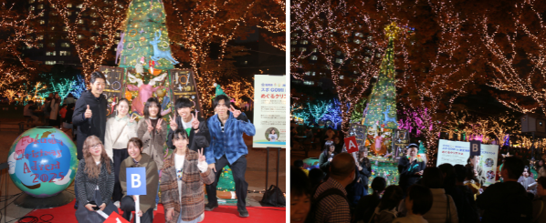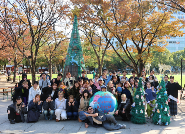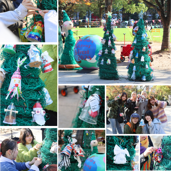 芸術学部ソーシャルデザイン学科の学生が、アーティストのしばたみなみ氏と一般社団法人イドベタ(以下、イドベタ)※と連携し、海洋プラスチックごみや廃材をリユースしたクリスマスツリー制作プロジェクトを実施しました。 完成した2本のツリーは12月25日(木)まで天神中央公園に展示され、クリスマスアドベント会場を彩っています。