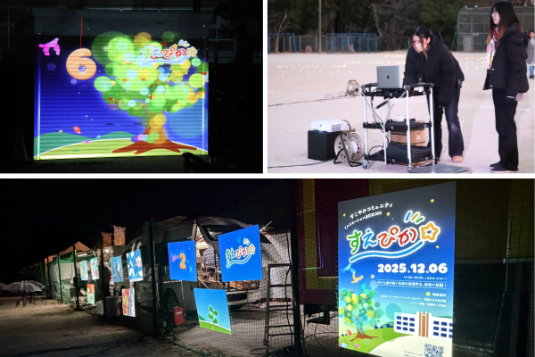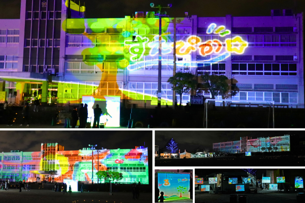 12月6日(土)、須恵第一小学校校区「すこやかコミュニティ」が主催する『すえぴか』イルミネーション点灯の一環で、本学芸術学部ソーシャルデザイン学科岩田敦之研究室が、夜の同校校舎に「未来の須恵町」を表現するビデオプロジェクションを行いました。