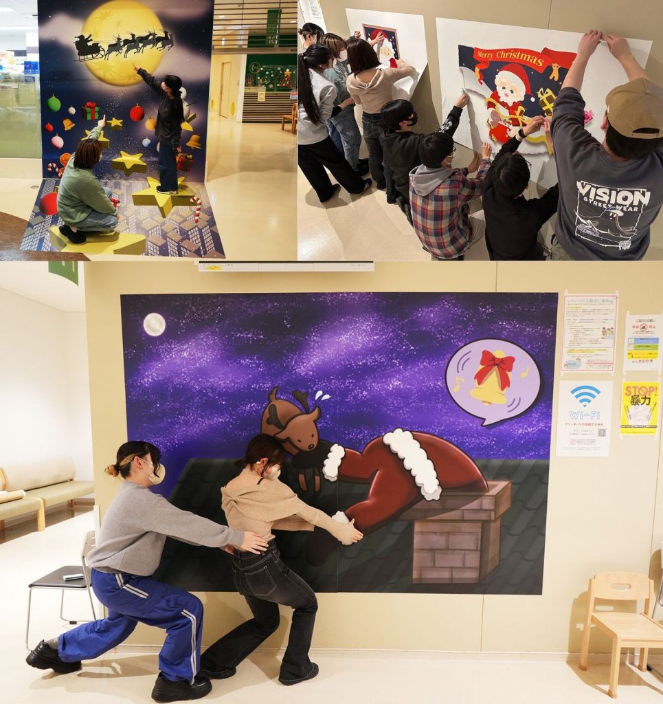 12月18日(木)~25日(木)、芸術学部経済学部の学生12名が制作したトリックアート(だまし絵)8点を、福岡市立こども病院(福岡市東区香椎照葉)内に展示しました。