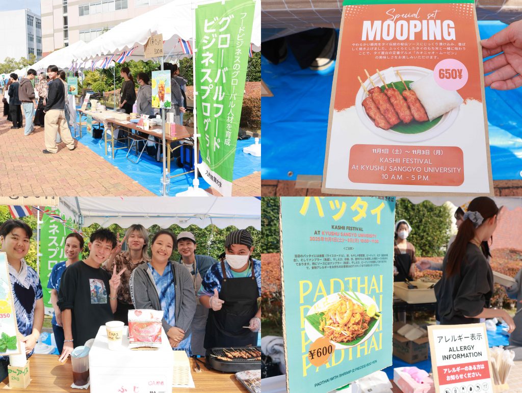 11月1日(土)~3日(月・祝)開催の香椎祭で、グローバル・フードビジネス・プログラム(GFBP)の学生たちがタイの協定校チェンマイ大学の学生とともにタイ料理ブースを出店しました。今回で2回目となる本取り組みでは、パッタイ(ライスヌードル炒め)とムーピン(豚の串焼き)を販売。香椎祭に合わせて来日した同大学生とともに調理や呼び込みを行いました。