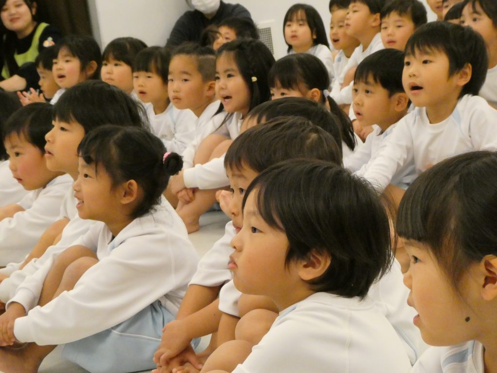 年少・年中・年長クラスの子どもたちは、身を乗り出して発表を鑑賞、クイズ形式のやり取りでは、子どもたちの活発な発言に落ち着いて対応する学生の姿が見られ、日頃の練習の成果がしっかり発揮できていました。お別れは、笑顔で「ありがとう」のハイタッチ!子どもたちの満足そうな笑顔に、充実した一日となりました。