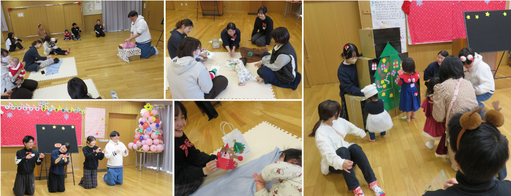 人間科学部子ども教育学科三原詔子准教授ゼミナールの3年生が中心となって企画・運営を行う親子クリスマス会は、今年で4年目を迎えました。学生たちは手作りのおもちゃでお出迎えし、手遊びやふれあい遊び、歌やパネルシアターを披露。会場には笑顔があふれました。