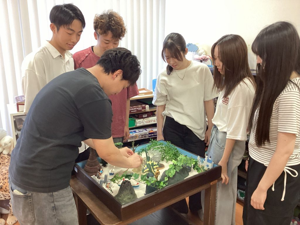 同センターの説明を受けた後、施設内のカウンセリングやプレイセラピーで使う部屋を見学。箱庭療法※で使用する箱庭を、今回は特別に簡易な体験版としてグループで作成しました。