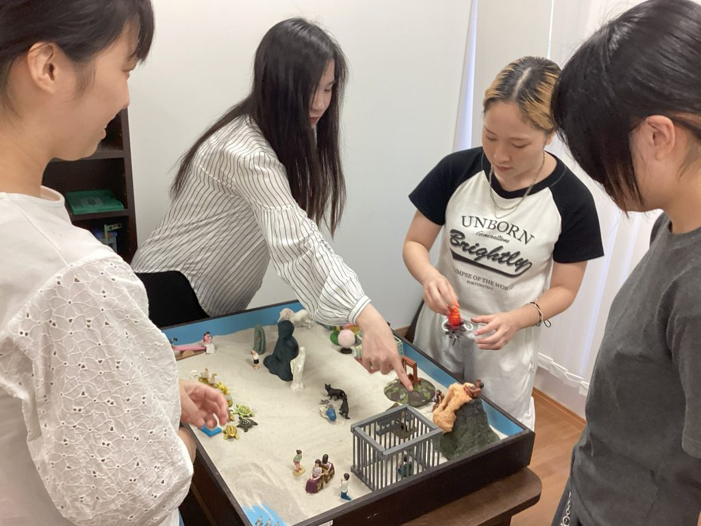 ※箱庭療法:心理療法の技法の一つ。個別のカウンセリングの中で砂の入った箱にミニチュアを並べ、自己表現を促す手法。