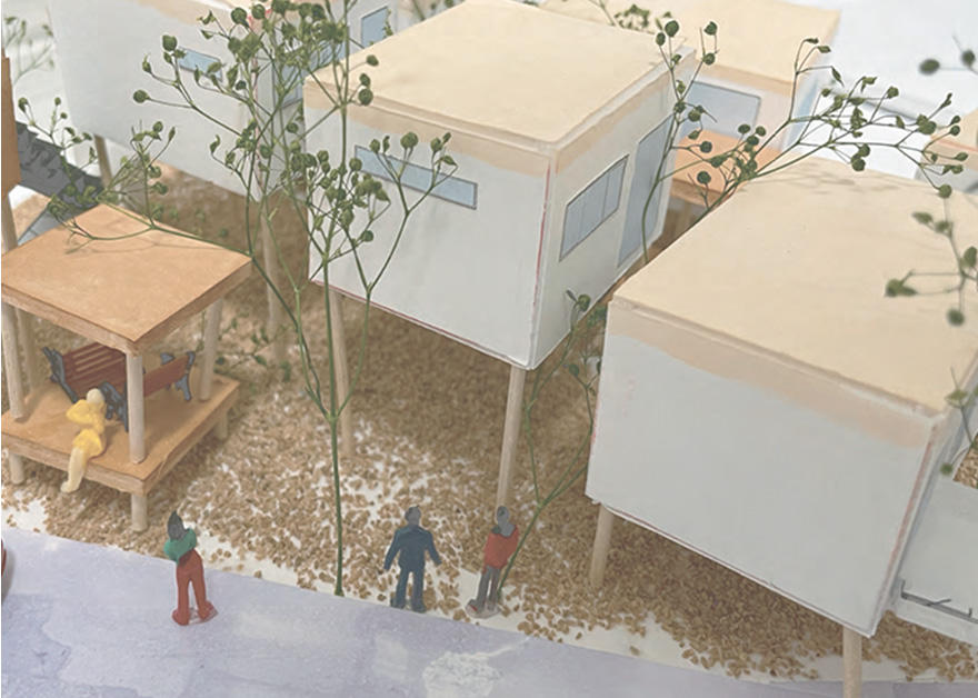 作者の地元である鹿児島において、歴史的建造物が残り多くの人々が訪れる観光地でありながらも宿泊者が少ない、吉野町のアップグレードを目的とした作品。現地での空き家・空き地調査をもとに3つのエリアにおいて分散型ホテルを設計し、さらに最寄り駅の改修設計、火山灰アートの体験施設、温泉施設、広場などを設計し、エリア全体のネットワーク化を行っている。作者の地元愛や設計に対する熱量を強く感じた作品。模型や断面図などの表現も優れている。