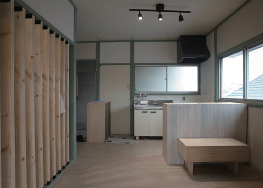 人が作ったものは、素材(物質)を選定し、加工し、接合し、取付けることでできている。セカイが視覚情報によるサーフェスのみで構成されていると錯覚している学生に、世界はサブスタンス(実体を伴った物質)でできていることを五感で感じさせること、これが教室内では教えられない最も学んでもらいたいことの一つである。自らこの難題に挑戦することを選んだ学生2名が、築古の木造2階建てアパートの内装設計・デザイン・DIY施工をやり遂げた。デジタル空間のアーキテクトに奪われた自分の身体感覚を、自らの意志で取り戻すこと、それがこの卒業研究の真のテーマである。