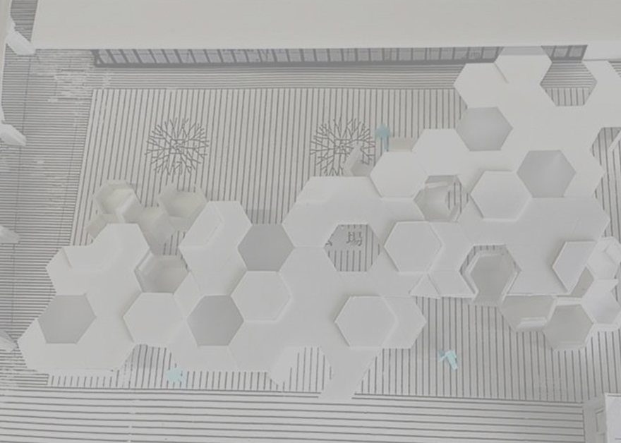 蜂巣の概念を3つに整理し、それらを学生の行為へ翻訳、そして空間化するという視点と方法が大変興味深い。全体構成が、人の流れをうまくコントロールし、また広場を複数の小規模な心地よいスケールの広場に分節している。六角形ユニットの中のベンチなどの作り方や屋根・天井の重ね合わせ方、透明ガラスと半透明ガラスの使い分け、意図的に不規則さを挿入するなど、細かい点にも気を配っていて、それらが空間の質を高めるのに寄与している。