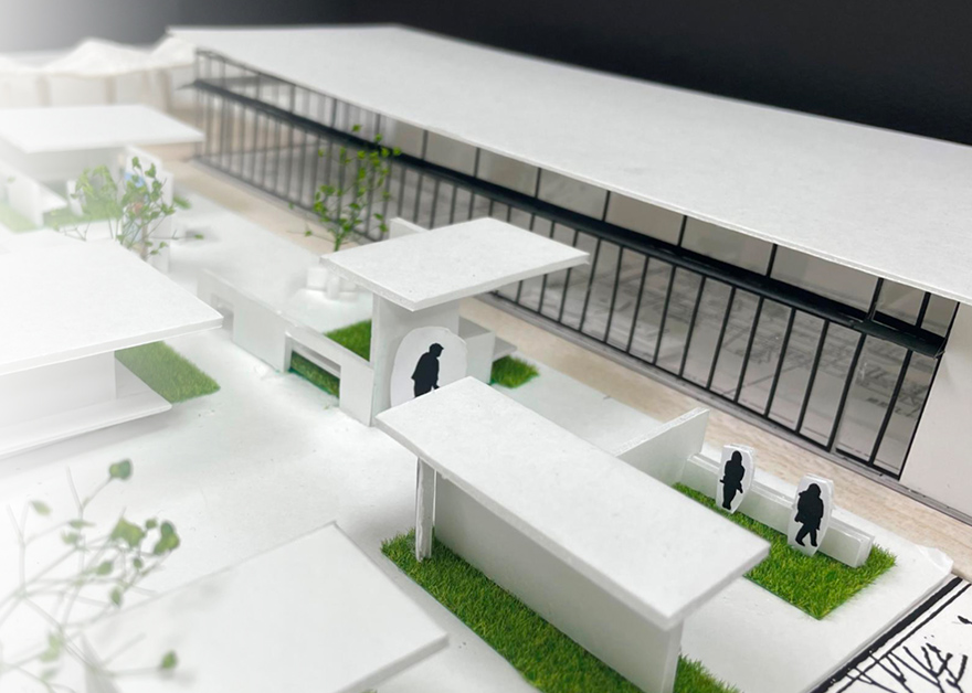 イノベーションセンター前の広場を、気軽に立ち寄れて周りを気にせずに憩うことができるような空間を設計しました。壁の高さは3パターンあり、立っていると周りが見えるが、座ると視界が遮られる1300mmの壁、立っていても隠れる2400mmの壁、屋根を支えるための3000mmの壁に分けられます。この3つの壁をコの字に組み合わせることで座っている時はプライバシーを守りつつ、立っている時は開けているような空間を作り出しました。ここにふらっと立ち寄ってみると有意義な憩いの時間を過ごすことが出来ると思います。
