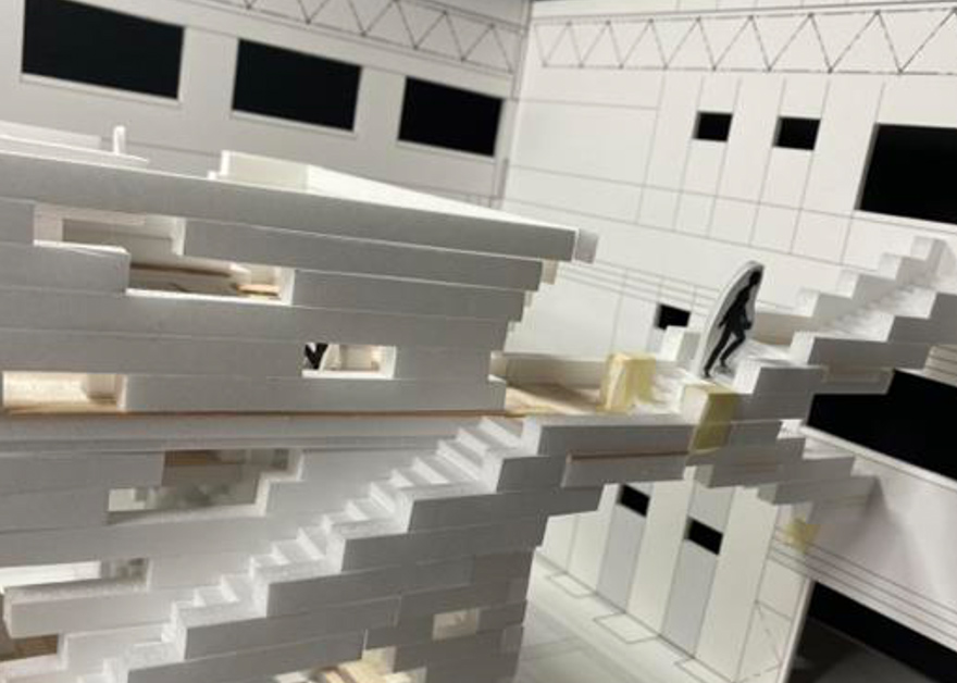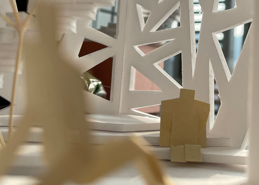 3層吹き抜けのアトリウムの中に置かれた、大胆な切り込みをもつ壁に囲まれた9M角の空間。その内部には不規則な角度を持って、時に外皮から飛び出すような小箱が宙に浮くように配置され、それぞれ個別に階段がつく。動的な空間と静的な空間が、移ろいゆく光と影の中に共存する。人工的なモノで作られ、かつ大胆な形態操作をしながらも、森の中に建つツリーハウスのような自然観を強く感じさせる点が興味深い。このような魅力や特徴が、タイトルにも反映させるとより伝わりやすい作品になったと思う。
