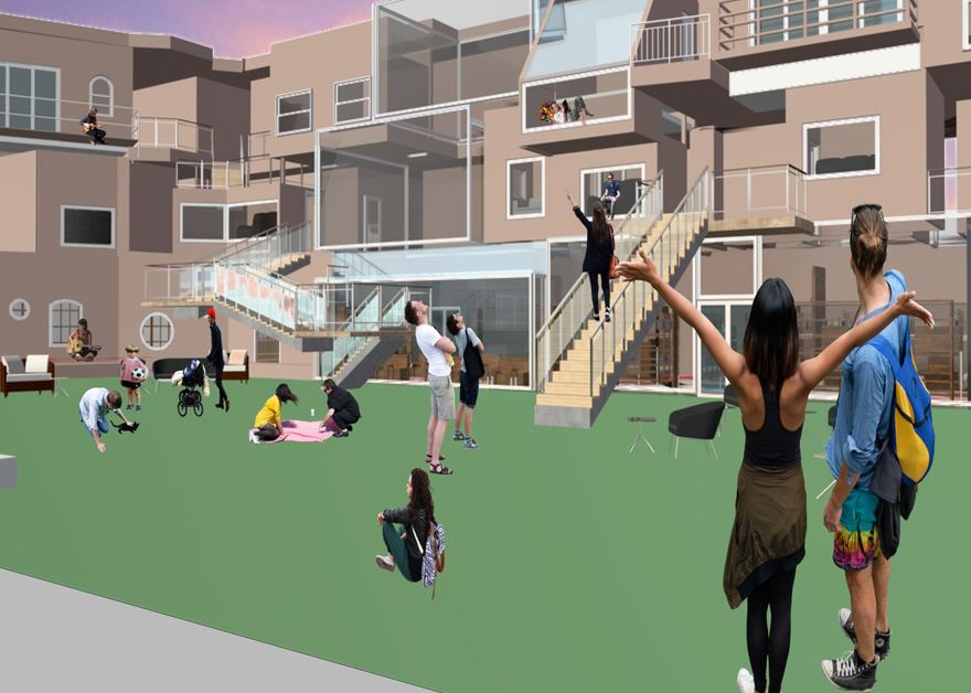 本学北門に接する敷地・現オープンイノベーションセンターを対象建築として、第一課題で書店にコンバージョン案を作成、第二課題で第一課題の案に宿泊施設を併設増築する案を作成しました。