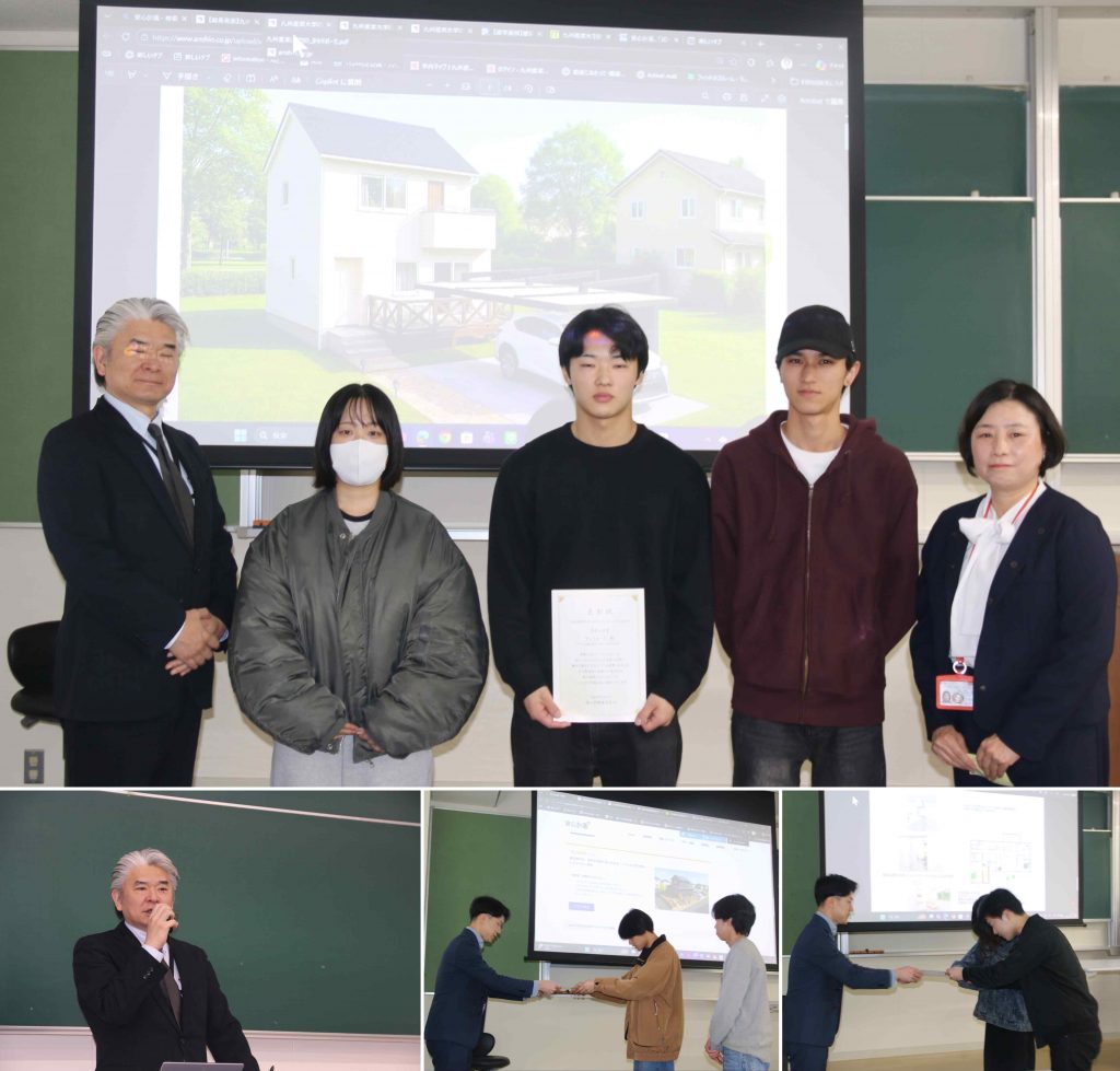 3月23日(月)、建築都市工学部住居・インテリア学科 香川治美教授が実施した3D-CADと生成AIを融合させた実務型特別講義のコンテストで、審査により優秀プランに選ばれた学生チームの表彰式を行いました。