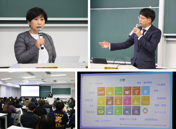 12月15日(月)、国際文化学部国際文化学科秋保さやか講師の「国際協力論」にて、一般社団法人海外コンサルタンツ協会(以下、ECFA※1)の河野敬子氏と、アイ・シー・ネット株式会社(以下、IC Net)の内田武志氏を講師に迎え、国際協力の現場について学ぶ特別講義を開催しました。