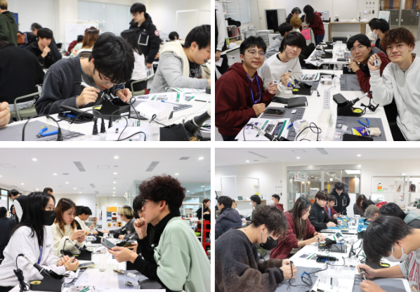 本学滞在中は、日本の大学における理工系授業の体験として、半導体に関する特別講義や電子カーテン制作などのオリジナルプログラムを実施。最終日には、同学部独自の「SMArtFusionプログラム 」受講生とともに、PICマイコンを使った電子ルーレット制作の体験しました。本学留学生が通訳としてサポートに入り作業が進む中、どのグループも英語や翻訳機を活用しながらコミュニケーションを取り楽しんでいる様子が見受けられました。
