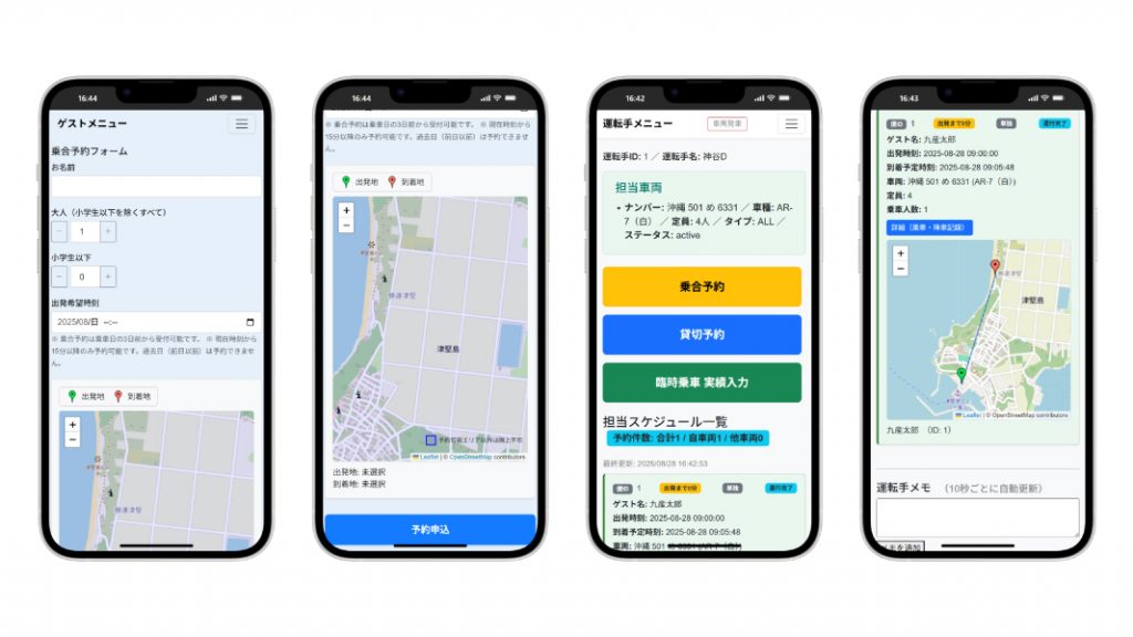 津堅島では、国土交通省「交通空白」解消緊急対策事業(第1次)に採択された事業の1つとして、電動モビリティを活用した公共交通の有償実証運行が実施されています。この実証運行に導入されたWebシステムでは、電話番号や氏名、予約日時、人数、出発地、到着地をそれぞれ入力し簡単に予約でき、利用における公共交友の利便性向上を目指しています。