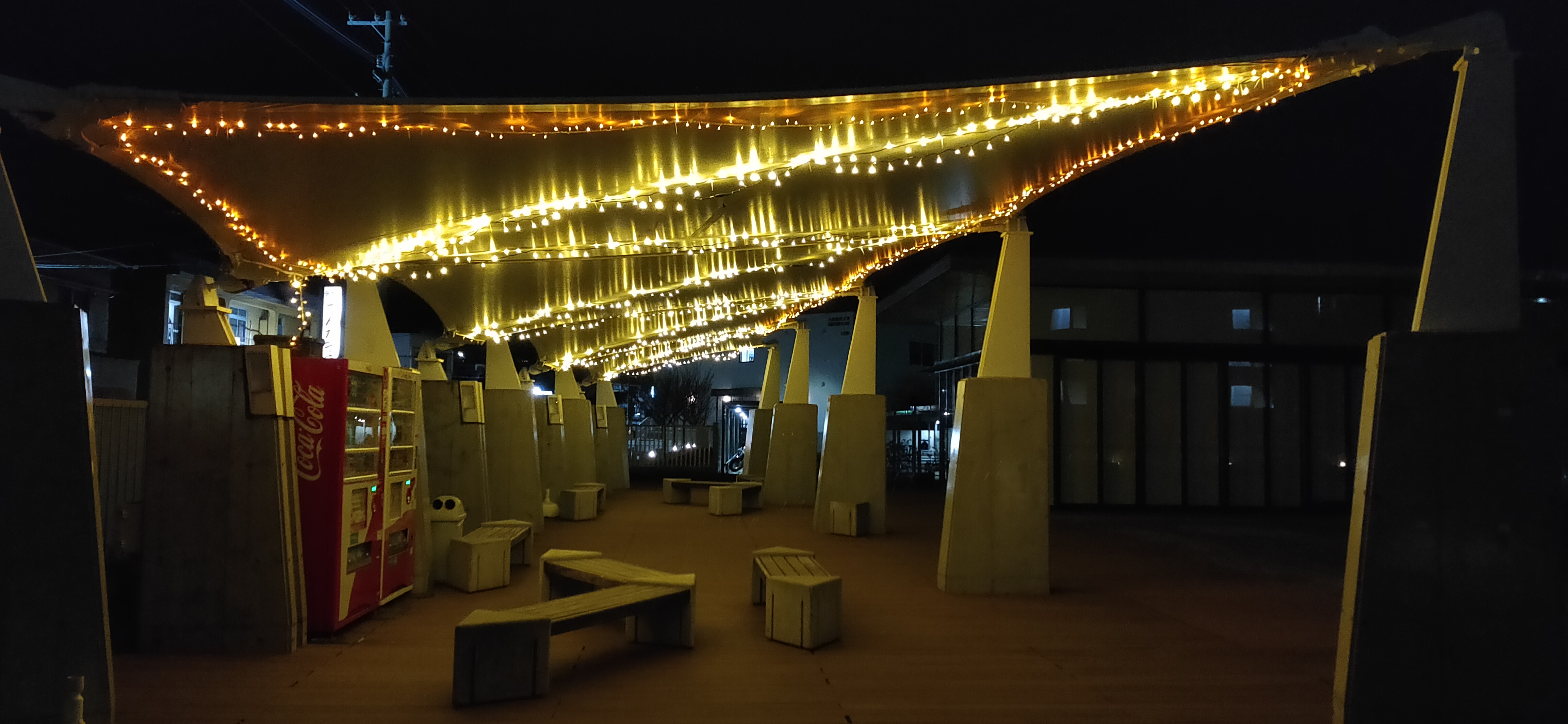 電気工学研究部の1年生の発案で、北門横のウッドデッキの帆の外周をオレンジの電飾で縁取り、中にはゴールドの電飾を取り付けました。