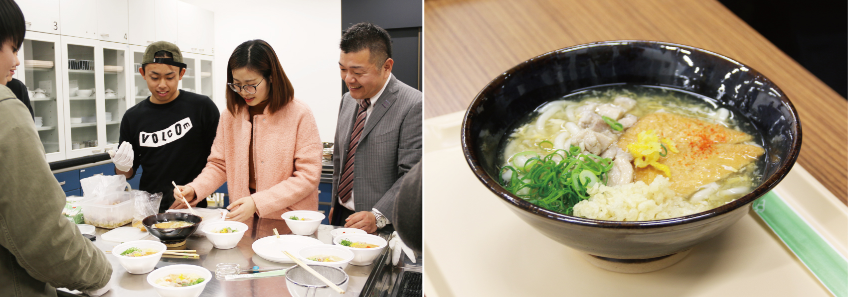 「ゆずうどん」を企画提案した3年のチャン ティ リエンさんは、「インターンシップでは、ホールで接客を経験しながら、キッチンで社長と試作を重ねました。ベトナム人にも受け入れられるように、見た目や色、鶏肉の食感、柚子の量、あんかけのとろみ、麺のコシなど細部にまでこだわりました」と自信作に胸を張ります。
