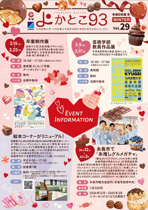 公開情報九州産業大学は地域に根ざした「地域密着型大学」を目指しています。2018年1月から情報発信誌「よかとこ93」を年4回発行することにいたしました。『93(きゅうさん)』とは九州産業大学の愛称“九産”を意味し、この情報発信誌を通して、地域の皆様に九産大の『よかとこ』を知ってもらおうと熱い思いを込めてご紹介します。