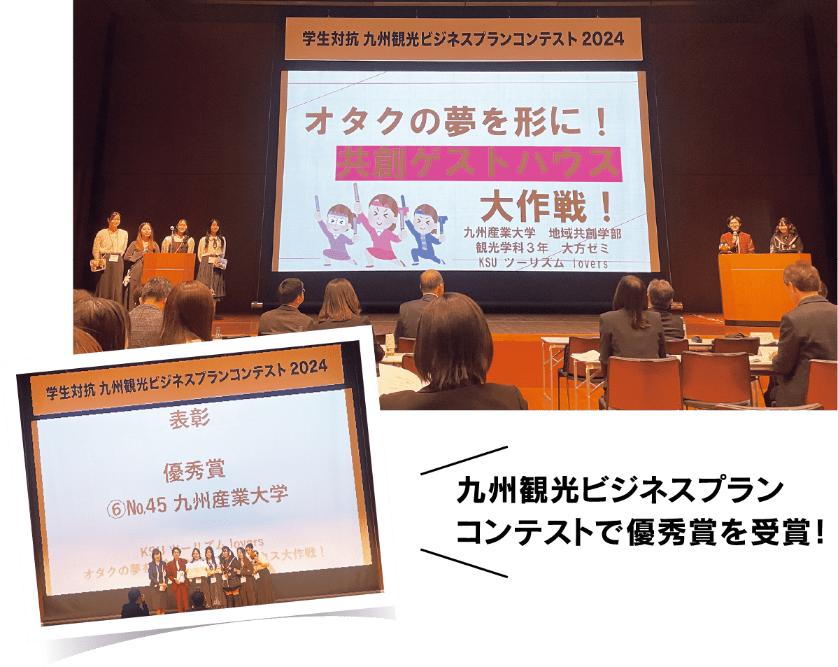 最近の活動で特に印象的だったのは、アニメ好きの学生が集まり聖地巡礼などを行う「オタクの推し活」で九州を盛り上げる企画を作成し、九州観光機構主催の九州観光ビジネスプランコンテストで優秀賞を受賞したこと。アジアだけでなく欧米からのインバウンドにアプローチできることが評価されました。自分の興味からスタートし、それをただ好きなだけで終わらせず「社会にどうつなげていけるのか」を考え提案できたのは素晴らしい経験になったと思います。
