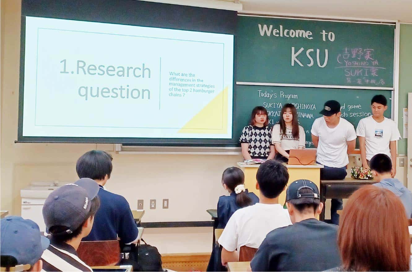 九産大は海外との交流が活発な大学。私のゼミでも海外の大学と積極的に交流しており、中国の名門・吉林大学の学生たちが来訪した際には日本企業のアジア進出などについて英語でプレゼンテーションを行ったり、ハワイ大学から来た学生たちと手巻き寿司を楽しんだりするなど、学内で海外と関われる機会が多数あります。本学の学生はコミュニケーション力が高く、海外の学生たちにも臆することなく積極的に関わるのでいつも感心しているんです。その力を、「企業活動が海外との関わりなしには成り立たない」この時代に役立ててくれたらと思います。