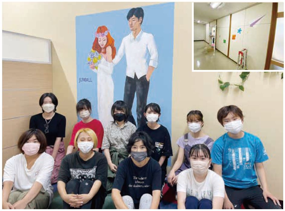 当センターは2021年に久留米市日吉町筑邦銀行2階に移転しましたが、独身男女の出会いのサポート場としては殺風景のままであったため、本学が協力し、センター内の壁3カ所や2階の廊下の全面の塗り替えを行ないました。センター内は出会い、信頼、愛をイメージする花言葉の「花」、共に歩く「道」、「若いカップル」をテーマとする絵をセンター内に制作し、廊下は「縁」をイメージしたデザインで仕上げました。その結果、明るくてほのぼのした空間として変身しました。