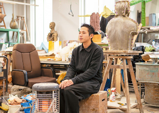 みんなの知恵とサポートでUBEビエンナーレの大賞を受賞 実はもともと芸術学部ではなく、別の学部で学んでいましたが、彫刻への興味が芽生え、造形表現専攻の大学院へ進学しました。道具や制作環境、そして指導してくれる先生方が揃った環境で学ぶため、長期履修制度を利用して充実した制作活動を続けています。昨年は、UBEビエンナーレ(現代日本彫刻展)に作品を出品しました。高さ4メートル、幅が2メートル、そして重さ2.4トンという大作で、基礎に使う素材や耐久性など解らないことばかり。担当の先生だけでなく、建築の先生などにも相談しながら制作を進めました。作品が完成しても、学校から積み出して現地に運ぶまでの作業も一苦労でした。みんなの知恵とサポートをお借りして、なんとか設置にこぎつけ、結果、大賞をいただくことができました。すべてが未経験で濃い1年となりました。九芸には交換留学制度などのサポート体制も充実しているので、今後は、海外での学びも視野に入れて積極的にチャレンジしたいです。