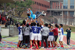 九州大学サッカーリーグは、ファーストステージ(4〜6月)とセカンドステージ(9〜11月)に分けて行われ、通算の勝ち点で順位を争います。