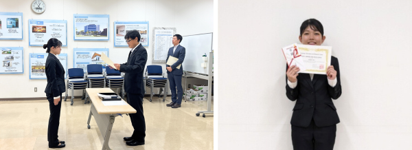 本年度から本プログラム成績優秀者を対象に「語学教育研究センター所長賞」を設け、受賞者には福島県の「BRITISH HILLS」での語学研修が贈呈されます。本年度は、建築都市工学部建築学科3年の冨千尋さん(春日高校)を表彰しました。