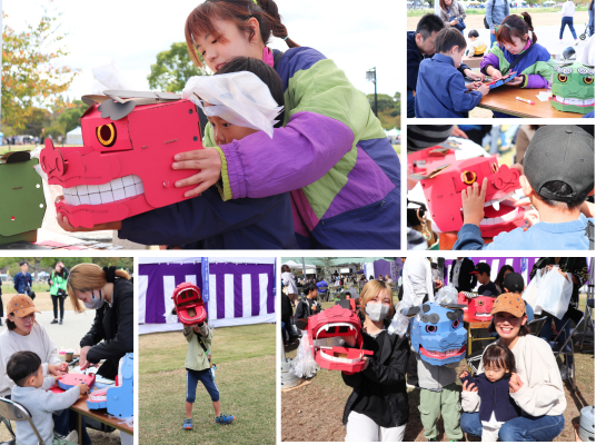 完成した獅子頭は口を開け閉めでき、子どもたちは自分だけのオリジナル獅子頭を手に大喜びの様子。特に、「獅子フェス福岡」の会場では、隣の本ステージで舞う迫力ある獅子舞の囃子の音に合わせて、小さな子どもたちが完成したマイ獅子頭を元気いっぱいに振る姿が見られ、まさに伝統とモノづくりが融合した光景となりました。