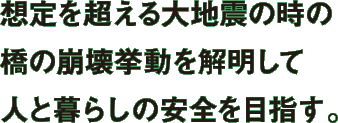 東北地方太平洋沖地震による津波は、各地の市町村に壊滅的な被害をもたらし、日本中に大きな衝撃を与えた。「甚大な津波被害と原発事故がきっかけとなり、想定外の事態にどう対処するか、という議論が活発になされるようになりました」と奥村准教授は語る。一般に、耐震設計は過去に経験した最大級の地震動をもとに行われる。しかし、これでは設計の想定を超える規模の地震が起きた場合に、致命的な被害を防ぐことは難しい。だからといって、過去の記録を上回る地震にも耐えられる基準を設定しても根本的な解決にはならない。また合理性を欠き、経済的にも現実的ではない。これを解決するためには、「想定外の地震が発生した場合でも、構造物がどのように崩壊するかを正確に予測し制御することで、壊滅的な被害を回避できるのではないか」と奥村准教授は考えている。