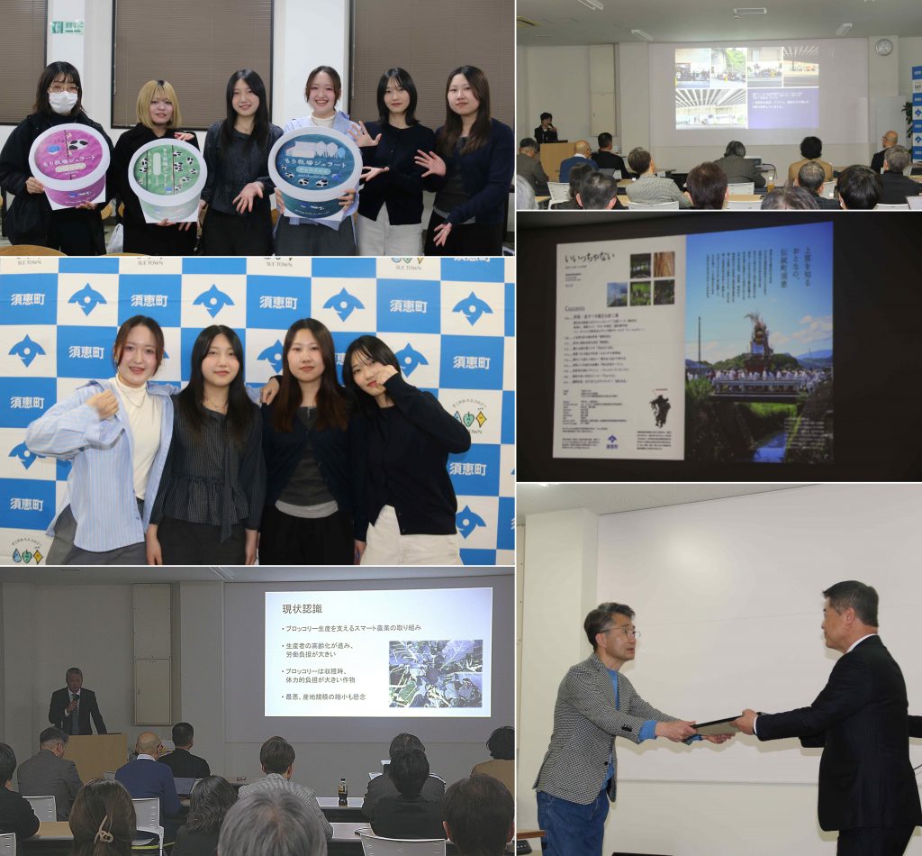 当日は平松秀一須恵町長をはじめ同町職員や町内関係者が出席し、本学教員と芸術学部ビジュアルデザイン学科3年生が町内事業者と連携して実施した活動について報告しました。